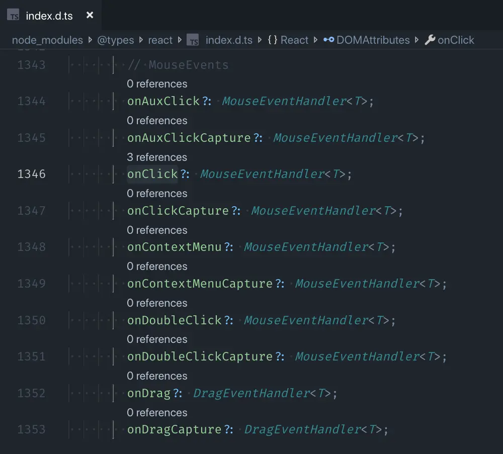 那么事件呢?当我们给组件定义事件处理函数的时候,也经常会被要求指定类型。还是老办法,找不到咱就搜,比如 onClick 不清楚,那我们就以它为关键字去搜: