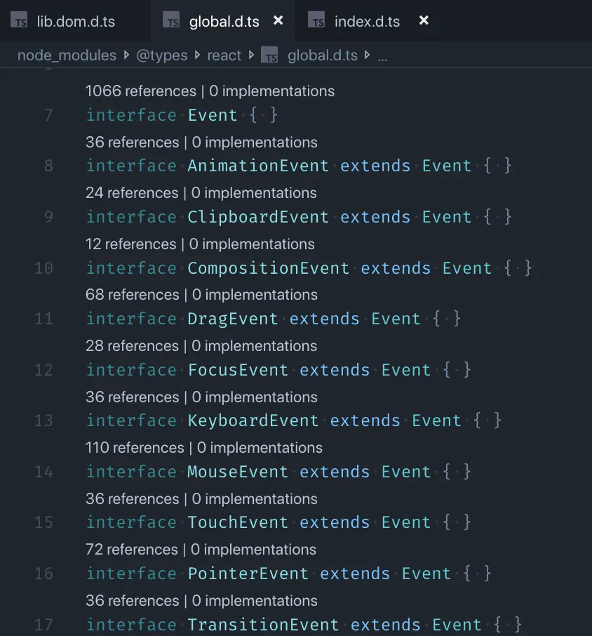 以此类推,不管是什么东西的类型,都可以去它们对应的 @types/xxx 里,按关键字搜,只要你的英语别太差,很容易就能找到。