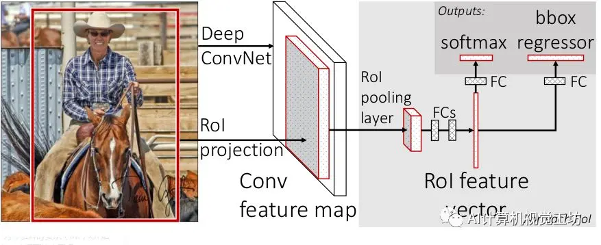 首先,看下这个CNN模型的构造,在VGG16的基础上,将卷积模块的最后一层最大池化层去掉,替换为一个ROI池化层。将原始VGG16网络最后一个全连接层与softmax层替换为两个同级层(全连接层和K+1个类别的softmax以及类别特定的Bounding-box回归)。