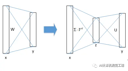 从而使计算复杂度变为u*t+v*t,如果t<min(u,v),则这种分解会减少计算量。这个实际意义,相当于把一个参数量比较大的全连接层拆分为两个参数量比较小的全连接层,如下图所示: