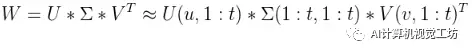 设某个全连接层的参数为u*v的矩阵W,将W进行SVD分解,并用前t个特征值来近似代替,如下:
