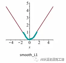 smooth L1损失函数曲线如下图所示,相比于L2损失函数,其对离群点、异常值不敏感