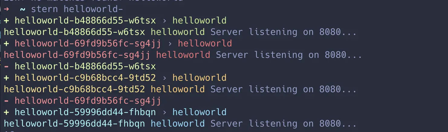 Stern 支持正则表达式,只需以 Pod 部署名称开头就可以跟踪所有部署 Pod 中的日志,并不需要知道每个 Pod 的确切名称。