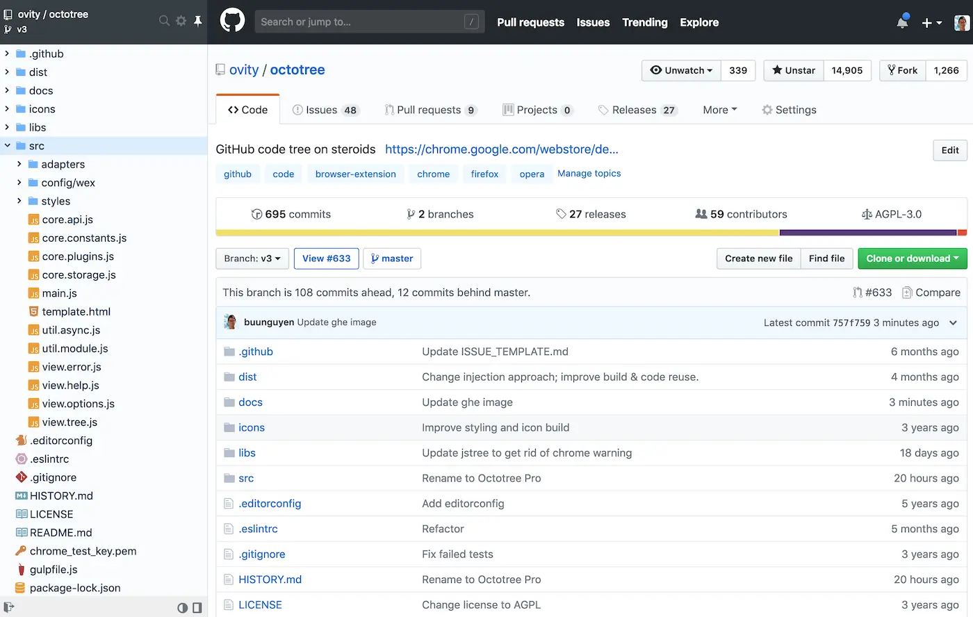 一个浏览器插件,可以将 GitHub 的仓库变成文件浏览器,提供便于查看的树状文件结构。