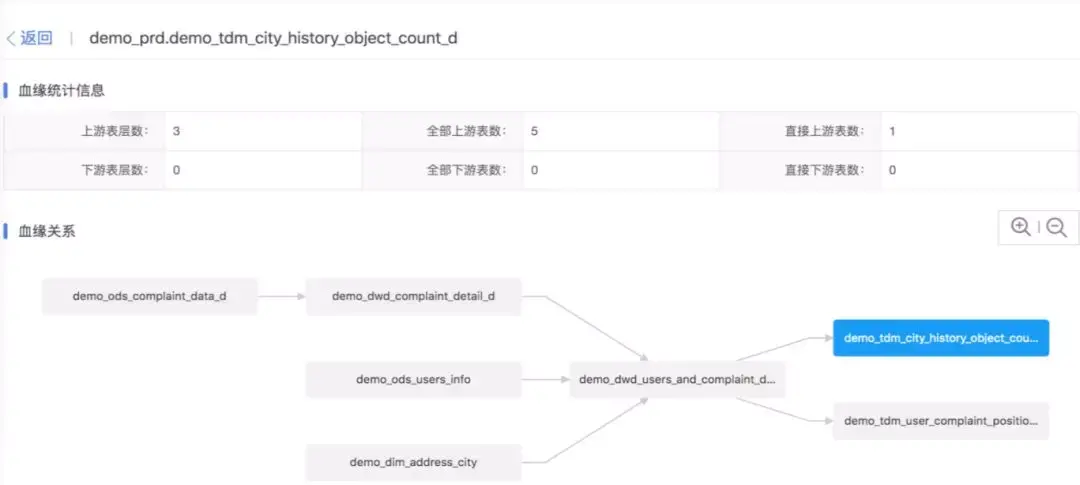 血缘分析指的是获取到数据的血缘关系,以历史事实的方式记录数据的来源,处理过程等。以某张表的血缘关系为例,血缘分析展示如下信息: