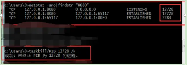 这个命令的意思是查找机器端口占用情况,然后会出现一堆。。。然后自己去找8080端口很麻烦,然后再运行netstat -ano:findstr “8080”就能找到只是8080端口的