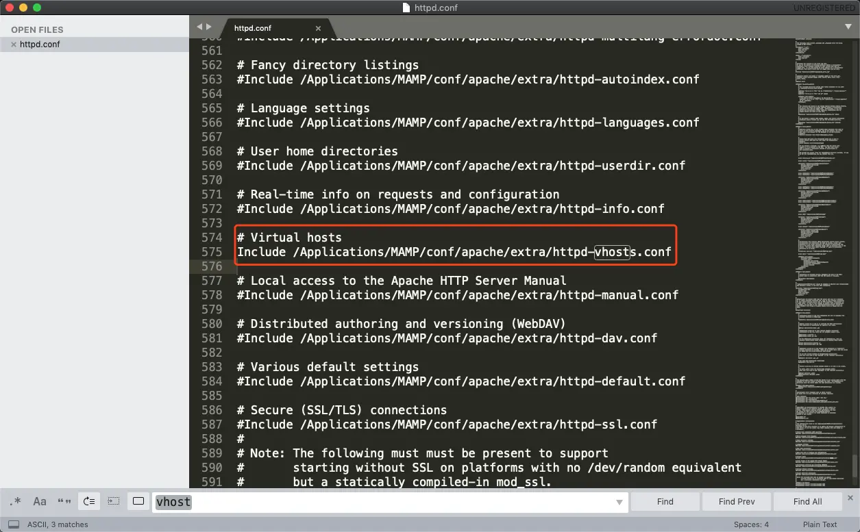 也还是在上面的路径中找到 httpd.conf 文件. 打开注释即可