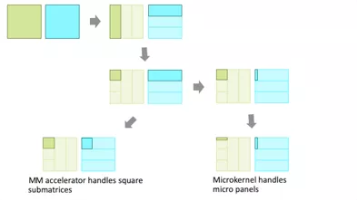 2. 在从存储层次的下层向上层运行的过程中,由于时间局部性,矩阵会递归式分块;由于空间局部性,矩阵会压缩打包。最终,矩阵会变成微面板,即小块行或列,并为软件微内核或GPU着色内核所用。