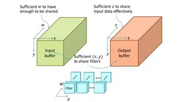 现在,假设芯片的记忆容量是有限的,并且需要基于芯片上的一大堆数据,在IFMs、OFMs以及卷积核中充分发挥CNNs的与MM相同的数据共享模式。这些数据的几何结构会是怎样的呢?如下图所示,这需要有充分的(x, y)来重复利用卷积核,充分的w使得有足够的输入数据被共享,以及充分的z来有效共享输入数据: