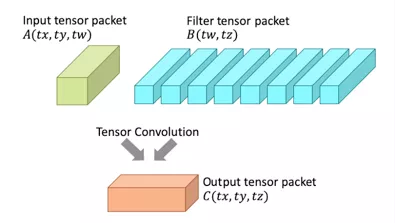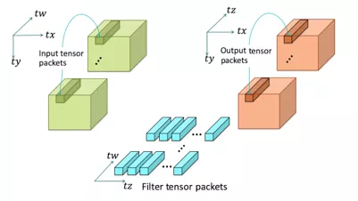 软件中的张量微核或者硬件中的张量包引擎可以用于处理卷积一个输入张量包A(tx, ty, tw)和一个卷积核张量包B(tw, tz)的原子级操作,如下图所示:
