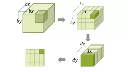 在计算单元中,张量包是基本单元。为了保留tile函数间的数据位置和平铺结构,在完整张量、张量包和张量块之间引入一个中间块,以完整涵盖想要放到芯片上的张量包。张量包是tile函数间的时间位置的基本单元,也是当有充分计算单元、芯片记忆容量和供应带宽时的空间局部性的基本单元。在x,y和z维上,一个张量块可定义为(bx, by, bz)。