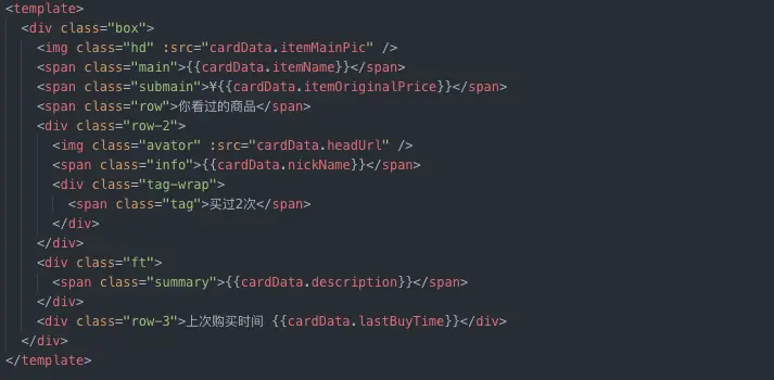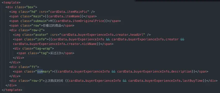 如示例,假如我们要显示用户头像,通过取到headUrl的值绑定在src属性上即可。因为是异步加载获取的数据,在最终获取到headUrl的值之前,我们需要先判断cardData.buyerExperienceInfo的存在性,然后才能取值,否则在视图初次渲染之前会报如下错误:
