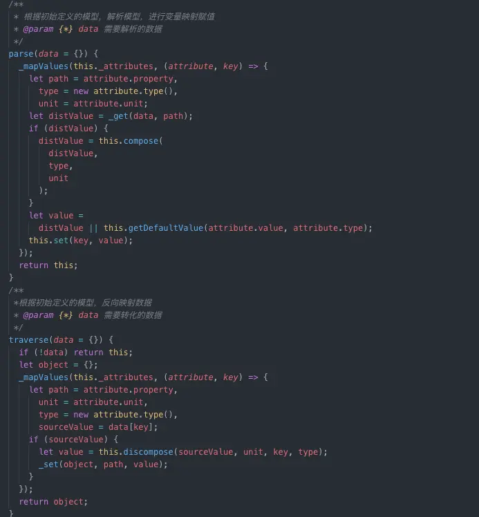 通过new Model()进行初始化,后续只需要通过model.parse(data)或者model.traverse(data)这个两个方法就可以完成正向映射和反向映射的过程。
