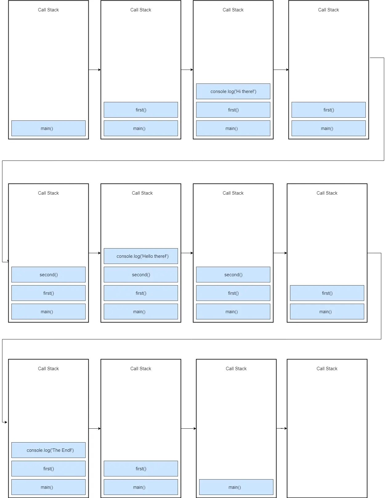 然后,console.log('Hello there!')被压入栈顶,当它执行结束的时候,就从栈顶弹出。之后,second()函数执行结束,从栈顶弹出。
