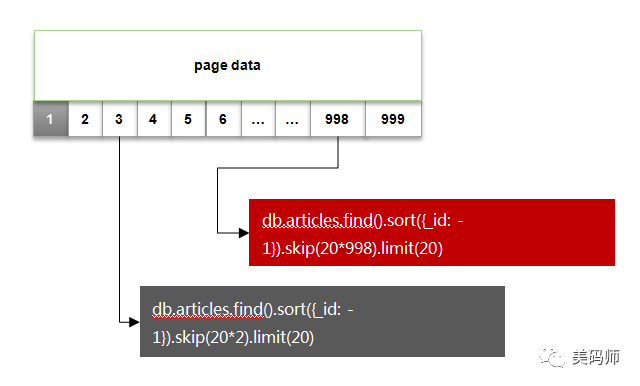 可以看到随着页码的增大,skip 跳过的条目也会随之变大,而这个操作是通过 cursor 的迭代器来实现的,对于cpu的消耗会比较明显。而当需要查询的数据达到千万级及以上时,会发现响应时间非常的长,可能会让你几乎无法接受!