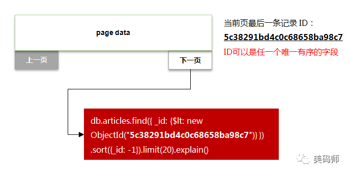 每次翻页时以当前页的最后一条数据_id值作为起点,将此并入查询条件中。