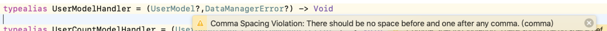 好吧,你是大佬,咱听你的,咱试试😜。果然,提示没有了。又搞定一个。总的来说:Comma Spacing Violation: There should be no space before and one after any comma.(comma)出现这个提醒,一般就是你的逗号周围没有间隔,代码阅读性需要提升,SwiftLint提醒你加个空格,是代码更容易阅读(不知道为啥逗号前面不能有间隔,后面必须有间隔才不会提醒😢)。