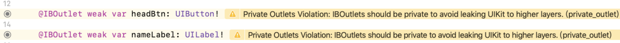 仔细一看提示说 ,推荐我们使用private来修饰我们的IBOutlets以防止内存泄漏。好吧,听你的,我用private。用private就会造成一个问题,你在控制器中就无法直接对IBOutlt对象赋值了,所以,将数据源传进来复制渲染UI吧。果然,这样一改,提醒就没了。perfect!总的来说:Private Outlets Violation: IBOutlets should be private to avoid leaking UIKit to higher layers.(privat...) 出现这个提醒,一般就是你的IBOutlet需要用private修饰。