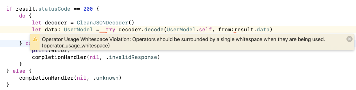 try前面多了空格,from后面少了空格。咱都处理一下。Bingo,这个提醒也没了。所以,以后看到这个提醒:Operator Usage Whitespace Violation: Operators should be surrounded by a single whitespace when they are being used.(operator_usage_whitespace) 。你需要检查一下你的代码里面是否多了空格或者少了空格,把他补上或者删掉就好了😀