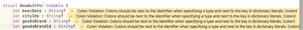总的来说:下次看到这个提醒 Colon Violation: Colons should be next to the identifier when specifying a type and next to the key in dictionary literals.(colon) 看看是不是你的引号前面空格了,把空格去掉就好了,后面没有空格也会有这个问题的,加上空格就好了。使用JsonExpert导出的model,普遍存在这个问题,大家稍微改一下就好了😀。