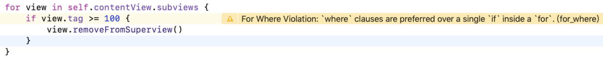 原来是Swift推荐我们使用 for in where来替代for in 里面再添加条件判断的,以前我们可能会在for in里面添加多种条件判断,但是代码层层嵌套,阅读和使用都更方便。当然filter函数也能达到目的,大家也可以自己尝试一下。所以,当大家看到 For Where Violation: `where` clauses are preferred over a single `if` inside a `for`.(for_where) 。这个是提醒大家遍历的时候可以把约束条件放在for in 后面
