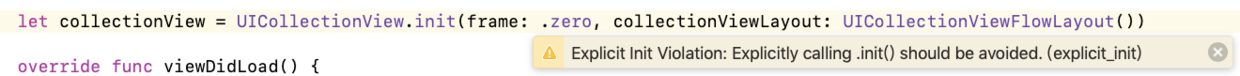 以后我们在创建的对象可以不用调用init,直接隐式创建就好了。所以当你遇到 Explicit Init Violation: Explicitly calling .init()should be avoided.(explicit_init) ,不妨检查一下你创建对象的方式,然后按照我的方式去解决它😀。