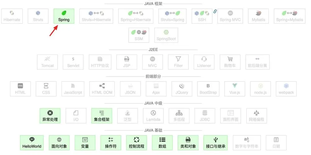 把不需要的东西先扔下。 传统的学习路线是决不允许你跳着学习的,在这里,在你确定了学习目标后,你就能得到一个最小化的学习路线。就像一名专属老师,而老师的力量,是让你有勇气放弃些什么。 比如,你现阶段的目标是学习Spring框架,那你就只需要学习下面这10个章节就可以了,其它的先扔下。