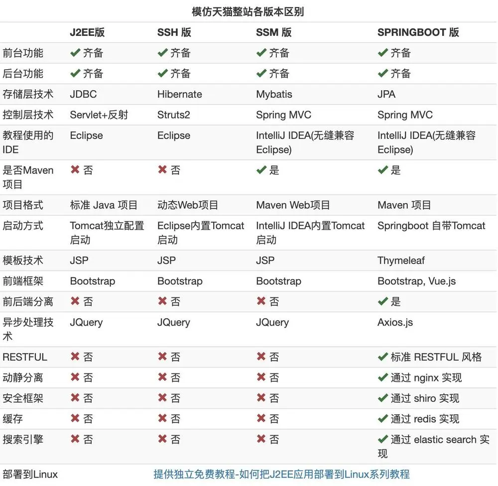 一个完整项目进行多次重构。 在这里,你将用4种技术实现同一个目标,对比J2EE、SSH、SSM、Springboot。 第一,许多重复的工作可以省略,比如建库,写前端等等,节省你的精力时间,集中突破新的技术。 第二,体会到真正的项目开发,从新建,到迭代,控制变量法,感受到技术间的区别和进步。 第三,以前学习不同的技术都是不同的例子,不同框架中的技术是错位的,没有直观的对比。