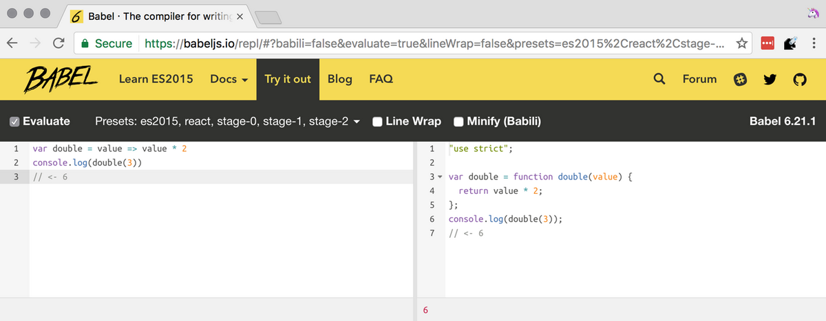 图 1-1:在线 Babel REPL 是交互式学习 ES6 的好工具