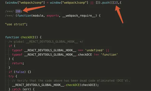 了解 webpack 的原理的话,可以知道,上图所示的两个数字分别是 chunkId 和 moduleId