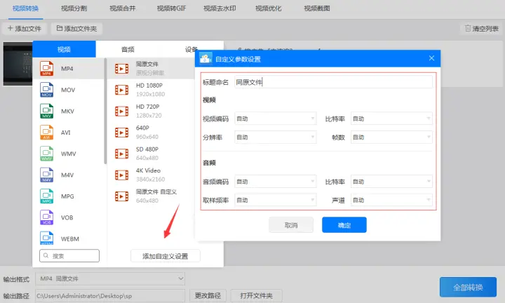 3、如果感觉所选的‘mp4同原文件’格式或软件预设的参数满足不了使用需求可以点击“添加自定义设置”按钮自定义视频(视频编码、比特率、分辨率、帧数)和音频(音频编码、比特率、取样频率、声道)的各项参数来满足使用需求。