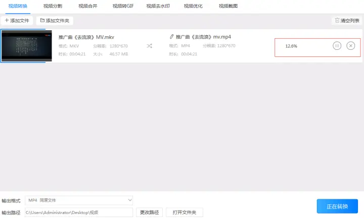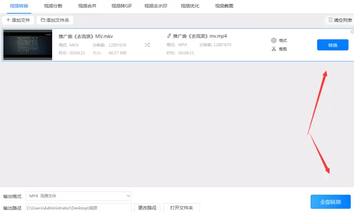 5、以上步骤完成后依次点击“转换”按钮逐个转换视频或者点击软件右下角的“全部转换”按钮统一把mkv格式转换成mp4格式。