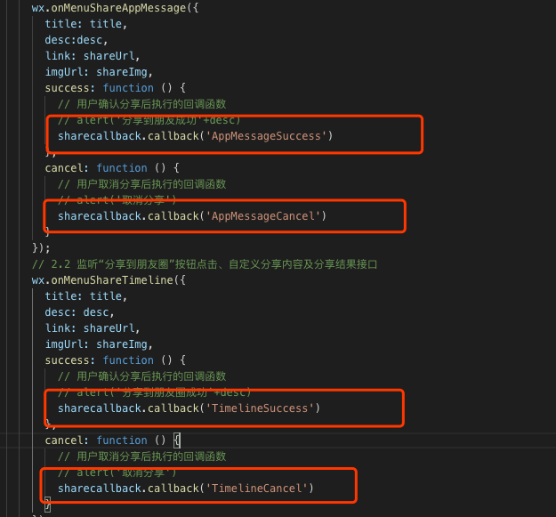 share_callback:'default'//default:未分享或者没回掉 AppMessageSuccess :分享给朋友成功 TimelineSuccess :分享给朋友圈成功 AppMessageCancel :分享给朋友取消 TimelineCancel :分享给朋友圈取消