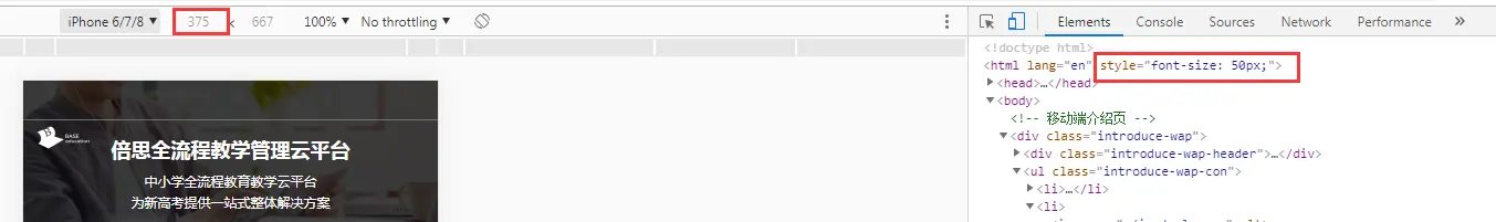 当页面的宽度大于750时,html的font-size恒等于100px,如果页面小于750px,页面中的html的font-size就是100 * ( 当前页面宽度/750 ),如下,iphone6的宽度375,对应的字体就是50px,和换算的一样