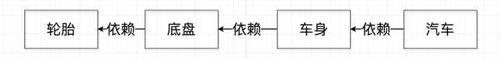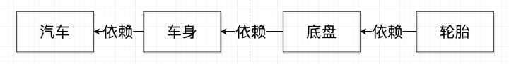 我们现在换一种思路。我们先设计汽车的大概样子,然后根据汽车的样子来设计车身,根据车身来设计底盘,最后根据底盘来设计轮子。这时候,依赖关系就倒置过来了:轮子依赖底盘, 底盘依赖车身, 车身依赖汽车。