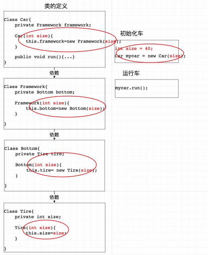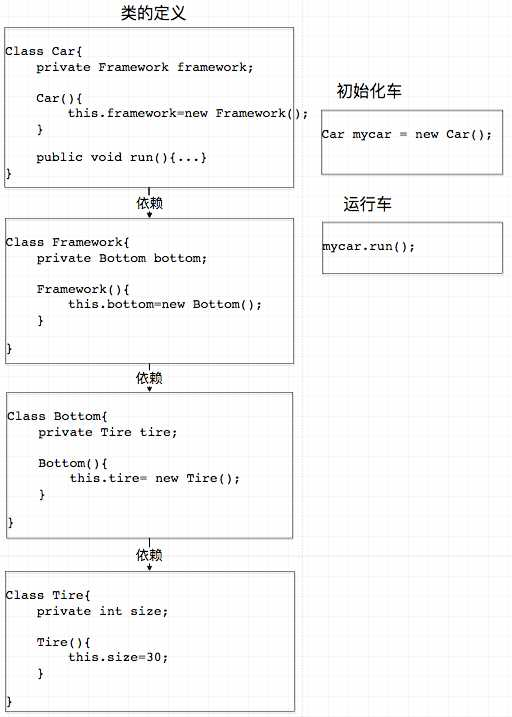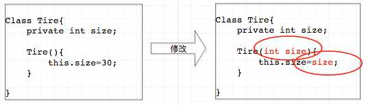这样,就相当于上面第一个例子,上层建筑依赖下层建筑——每一个类的构造函数都直接调用了底层代码的构造函数。假设我们需要改动一下轮胎(Tire)类,把它的尺寸变成动态的,而不是一直都是30。我们需要这样改: