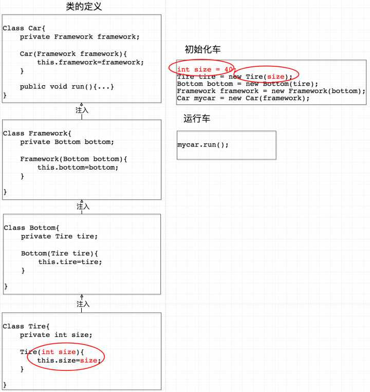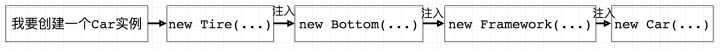 这个过程中,我们需要了解整个Car/Framework/Bottom/Tire类构造函数是怎么定义的,才能一步一步new/注入。