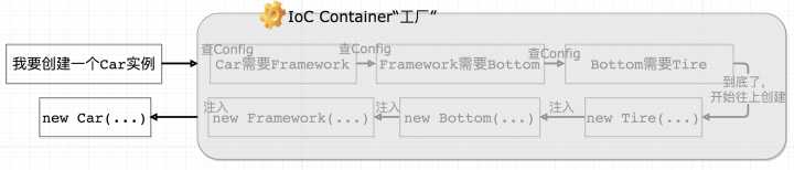 而IoC Container在进行这个工作的时候是反过来的,它先从最上层开始往下找依赖关系,到达最底层之后再往上一步一步new(有点像深度优先遍历):