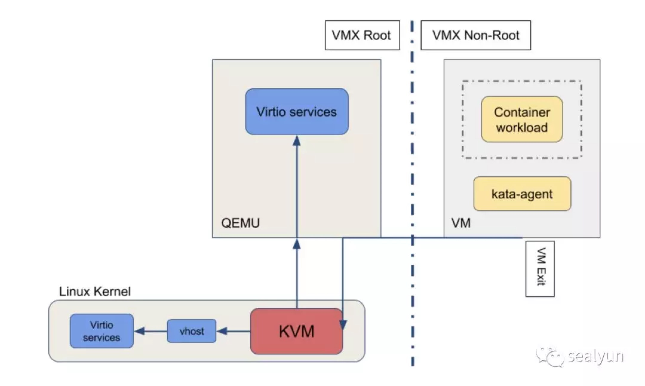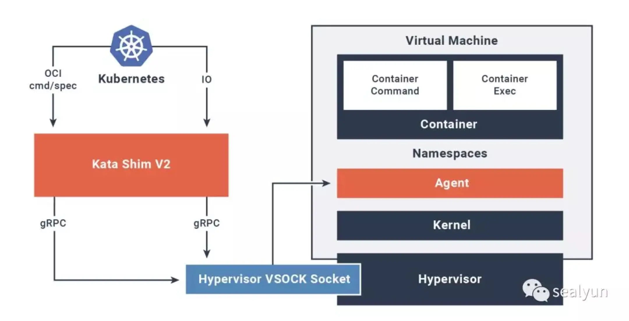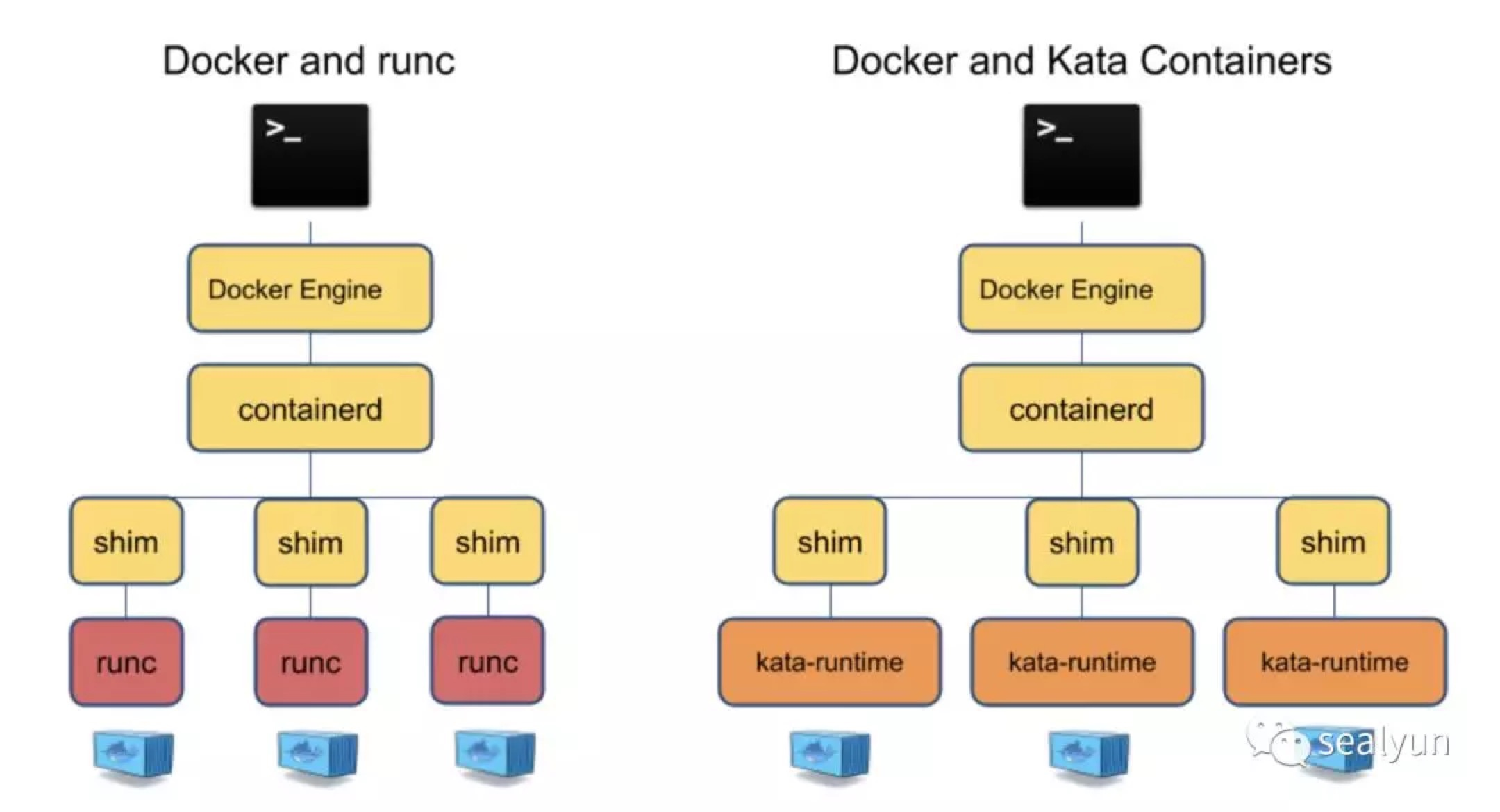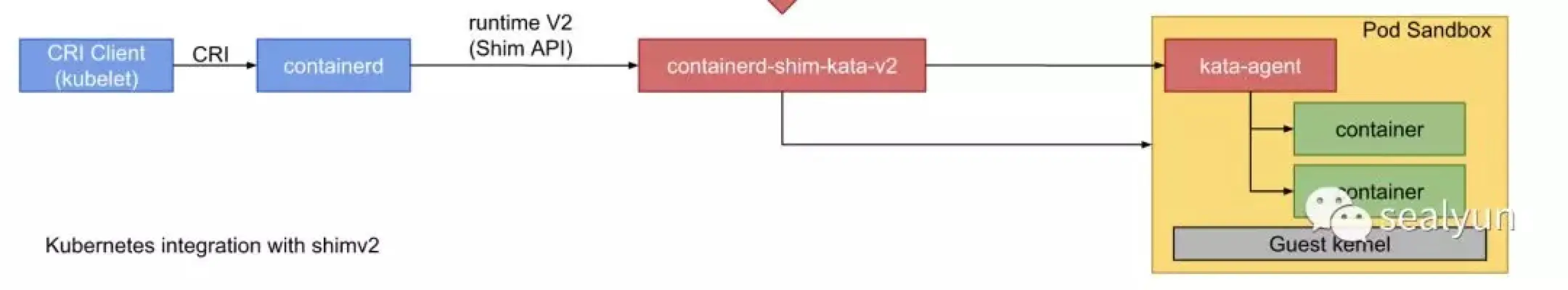 所以kata runtime替代掉的是runc部分的东西,因为中间有containerd,所以上层如docker k8s感知不到运行时的变化。