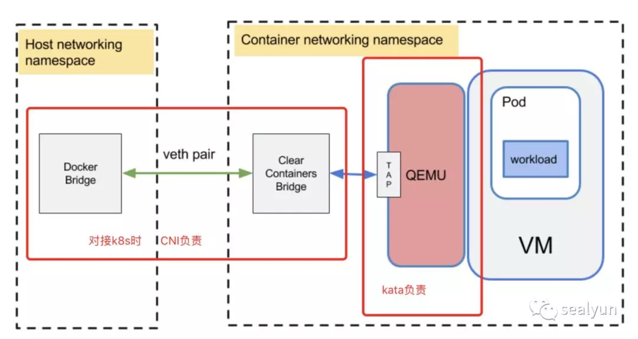 这个图虚线左边不用看,本质就是调用qemu命令创建虚拟机,右边实际上kata是把k8s pod这个壳本来是容器,换成了虚拟机,但是有很多细节: