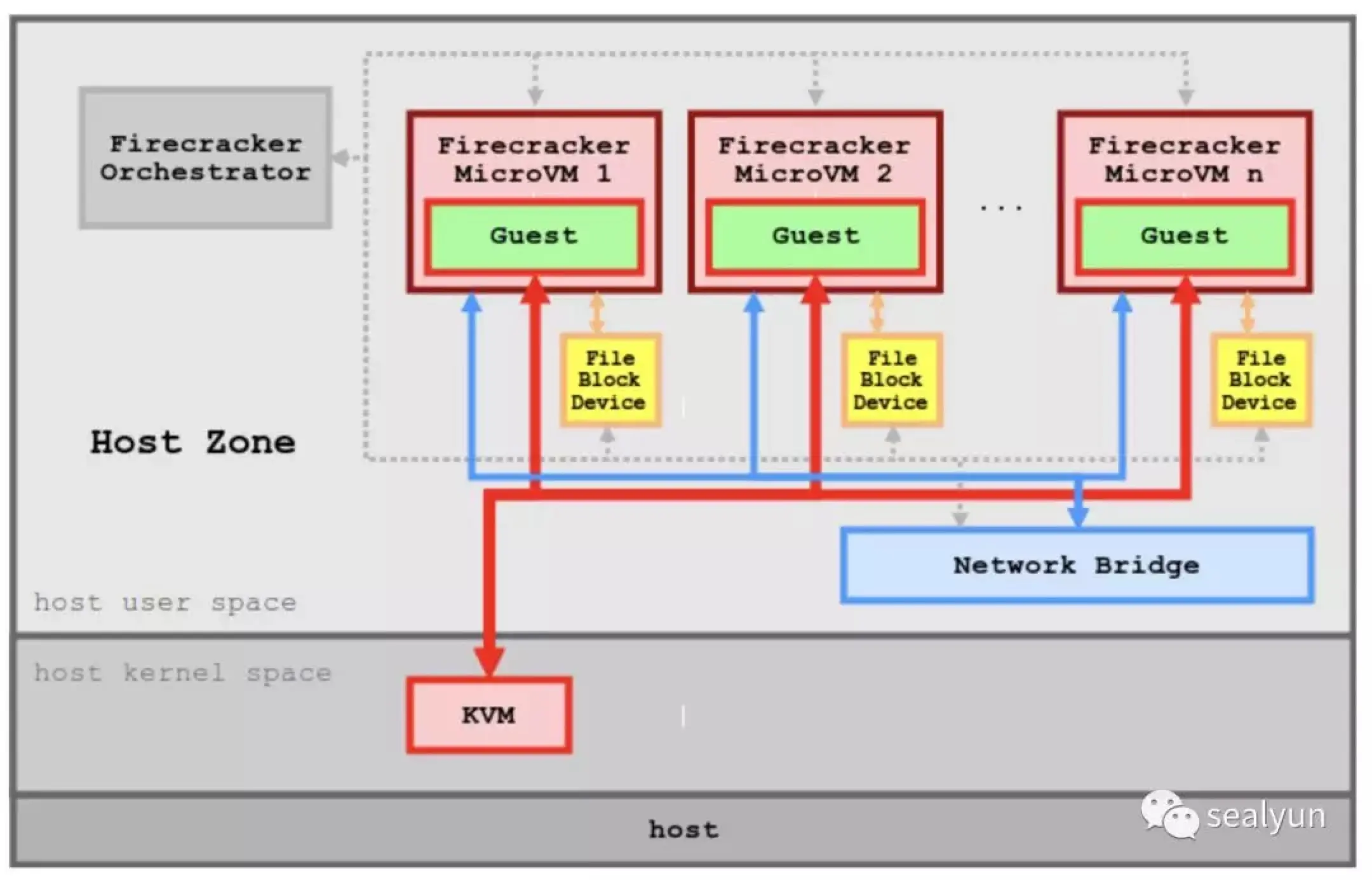 qemu 和firecracker是一个级别,真正去启动虚拟机的,和张磊大佬交流时这里引用大佬一句话:qemu是在一大坨功能上做减法,firecracker是在非常核心简单的功能上做加法。
