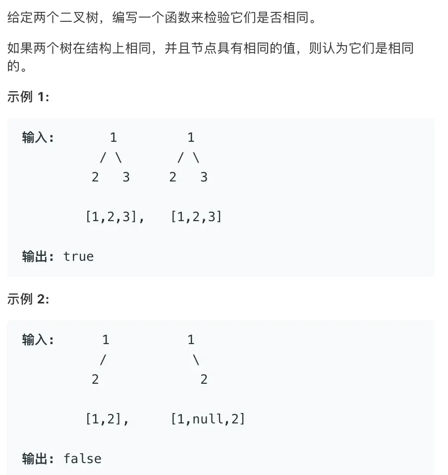 本题我们采用前序遍历的方式遍历二叉树,但是有一点不同的是,当遇到空节点的时候不能直接跳过,需要有一定标记,用于对比两棵树的节点出现的顺序以及数值是否完全相同。