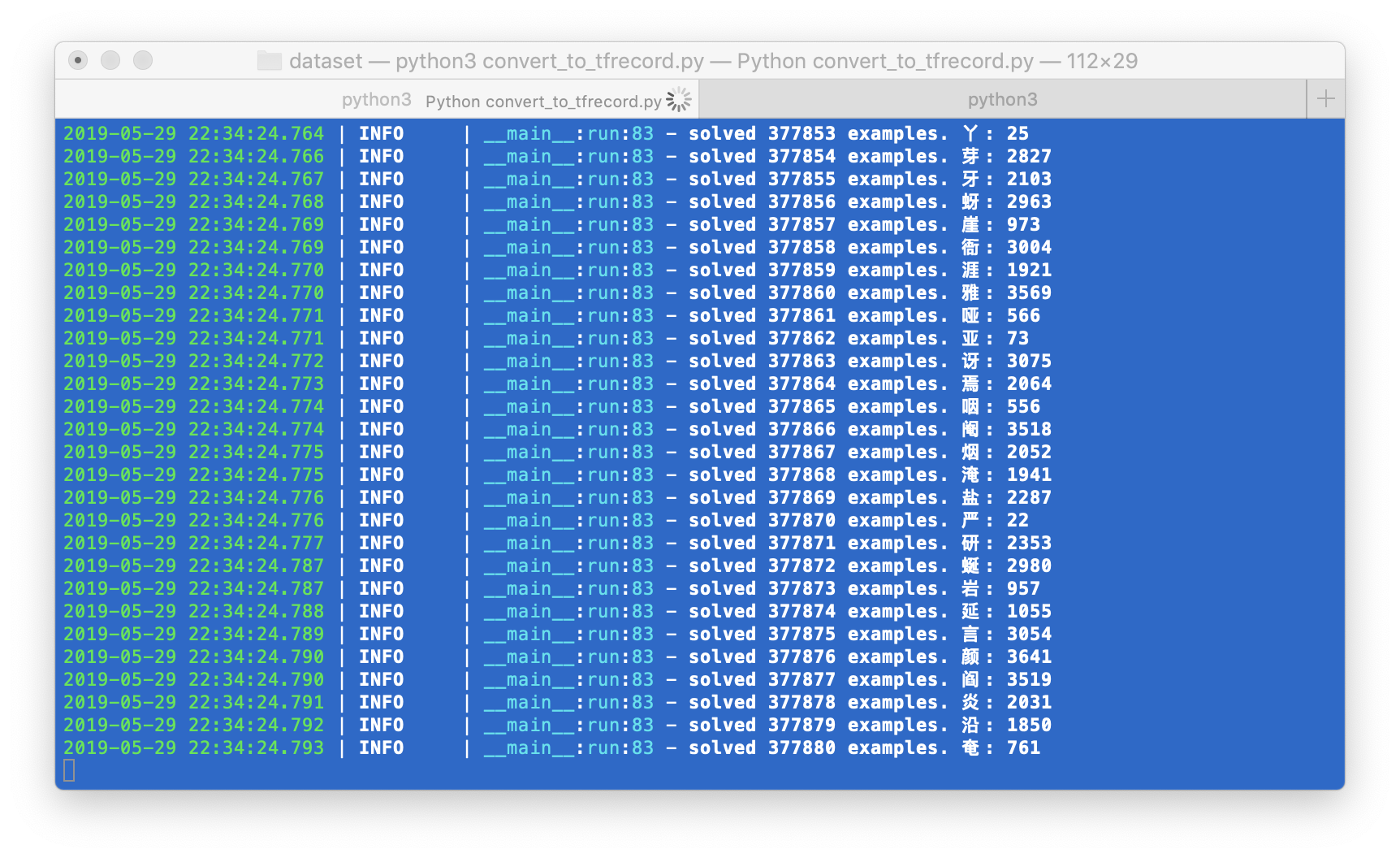 cd dataset && python3 convert_to_tfrecord.py, 请注意我们使用的是tf2.0;- 你需要修改对应的路径,等待生成完成,大概有89万个example,如果1.0和1.1都用,那估计得double。