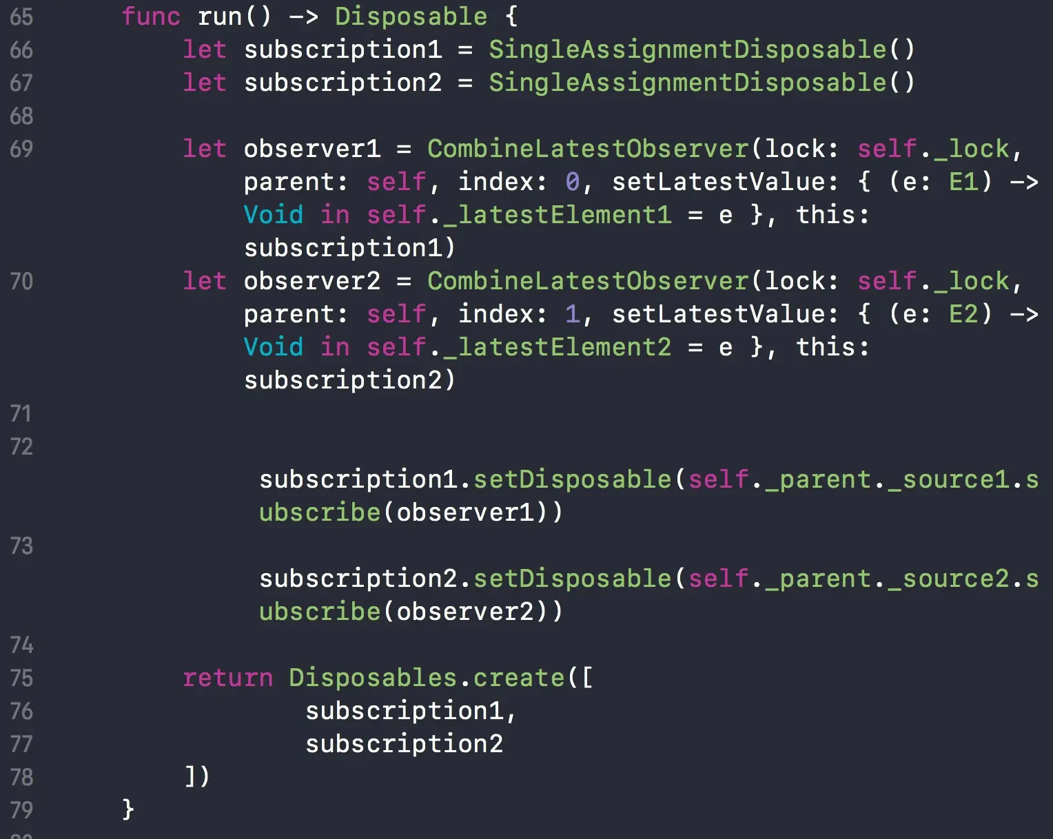 run 函数中,初始化了两个组合观察者 CombineLatestObserver。同时让两个源序列 subscribe 两个观察者。