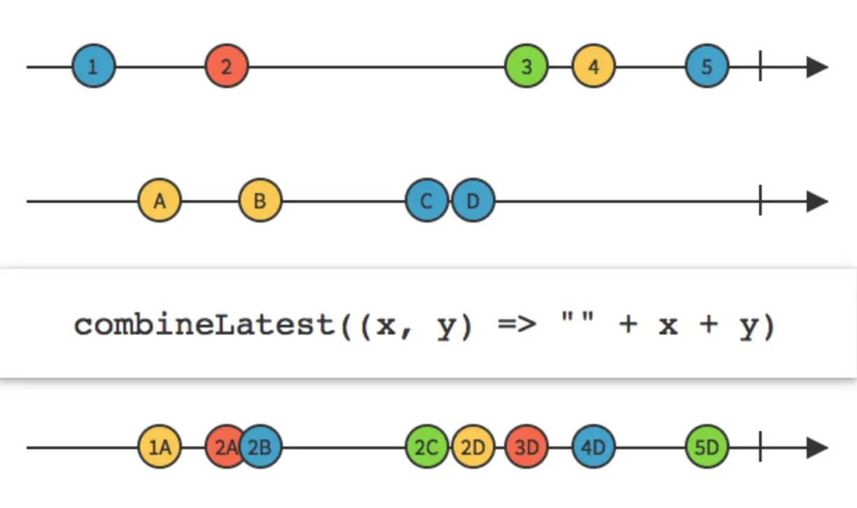 Observables中最新的元素通过一个函数组合起来,然后将这个组合的结果发出来。这些源Observables中任何一个发出一个元素,他都会发出一个元素(前提是,这些Observables曾经发出过元素)。