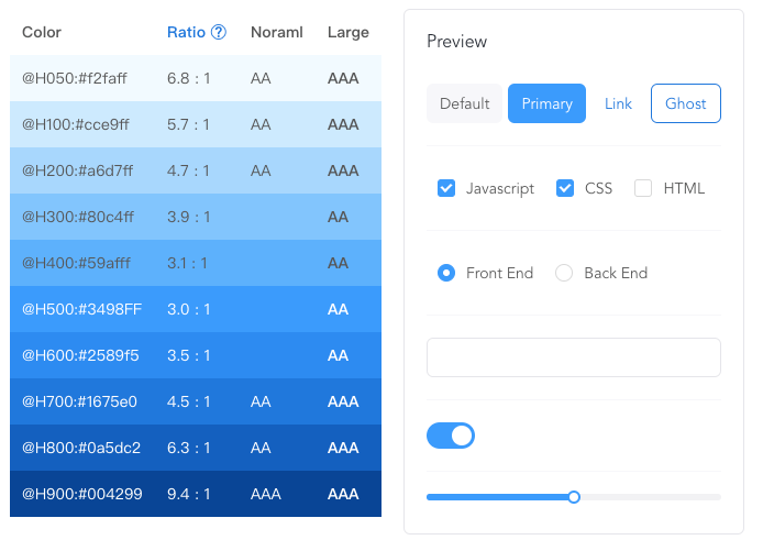 我们多次与设计师沟通后,在 React Suite 4.0 版本中,针对颜色对比度做了改善,最低对比度从 3:1 调整到 4.5:1 满足了 AA 级标准。同时我们会在色板工具上提供对比度标准参考,方便大家在自定义主题的时候能够满足标准。目前 React Suite 还是 4.0 alpha 版本,还剩下一些测试等收尾工作,同时希望得到大家更多的宝贵建议。