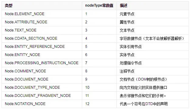 另外还有一些节点类型,分别表示文本内容、注释、文档类型、CDATA 区域和文档片段。