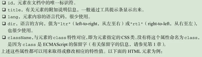 <div id="myDiv" class="bd" title="Body text" lang="en" dir="ltr"></div> var div = document.getElementById("myDiv"); alert(div.id); //"myDiv"" alert(div.className); //"bd" alert(div.title); //"Body text" alert(div.lang); //"en" alert(div.dir); //"ltr" div.id = "someOtherId"; div.className = "ft"; div.title = "Some other text"; div.lang = "fr"; div.dir ="rtl";-