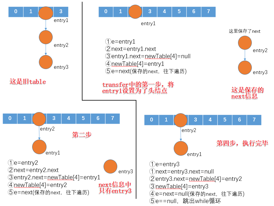 - 调用transfer方法将entry从旧的table中移动到新的数组中,具体细节如上所示