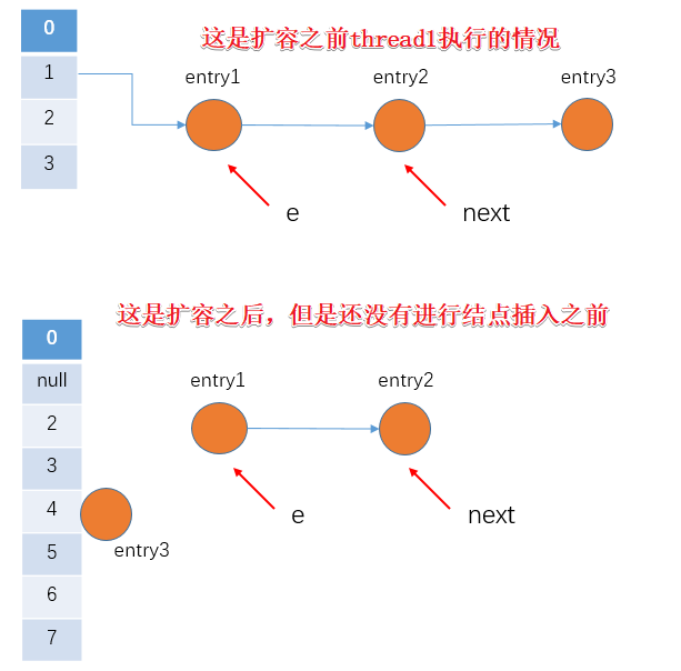 - **先是执行 newTalbe[i] = e;**在thread1执行时候,e指向的是entry1